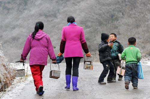 Holding makeshift stoves, students walk on their way home after school on an iced mountain road in Xinhuang Dong autonomous county in western-most Hunan province, Jan 6, 2011. [Photo/Xinhua]
