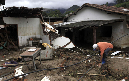 A man cleans his house after a landslide in Vieira, a mountainous region north of Rio de Janeiro, Brazil, Jan 16, 2011. [Photo/Agencies] |