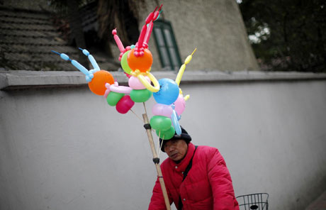 A balloon vendor rides his bike on a street in downtown Shanghai January 25, 2011. [Photo/Agencies]