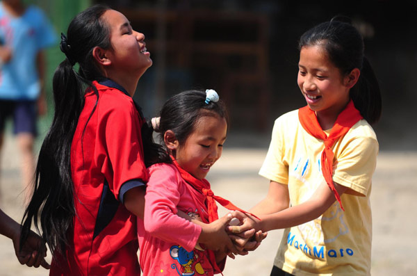 ![]() Students play near their tent classroom in quake-hit Yingjiang county in Southwest China's Yunnan province, March 14, 2011. [Photo/Xinhua] |