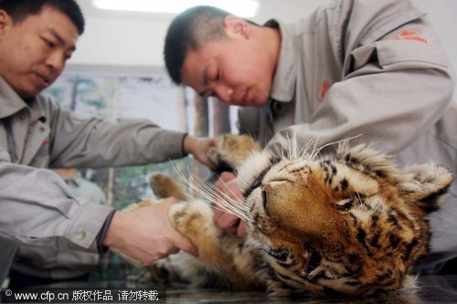 Workers prepare a Siberian tiger specimen at the Provincial Museum in Northeast China’s Heilongjiang, March 17, 2011. [Photo/CFP]