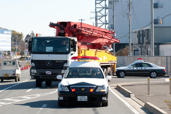 A concrete pump truck offered for free from China’s Sany Group to Tokyo Electric Power Company (TEP) enroute to the crippled Fukushima nuclear plant, March 27, 2011. [Photo/Xinhua] |