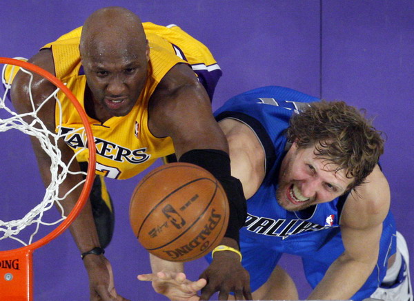 ![]() Dallas Mavericks' Dirk Nowitzki (R) of Germany fights for a rebound with Los Angeles Lakers' Lamar Odom during Game 1 of their NBA Western Conference semifinal playoff basketball game in Los Angeles, California May 2, 2011.[Photo/Agencies] |