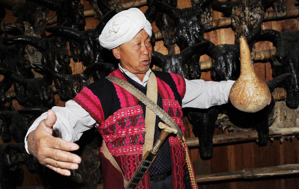 The tribe leader of a Deng village in Zayu county, Nyingchi prefecture of Tibet autonomous region introduces their people's traditional way of life to tourists on April 25, 2011. He said his son will not inherit his title and the tribes will step into a modern world. [Photo/Xinhua]