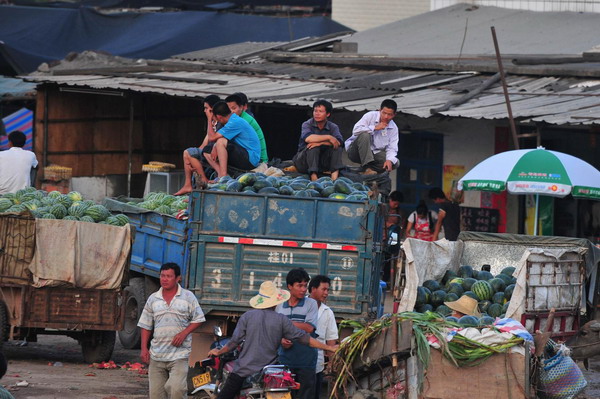 Watermelon growers wait for assemblers at a farmers market in Suyu township of Nanning city, South China's Guangxi Zhuang autonomous region, June 13, 2011. [Photo/Xinhua]