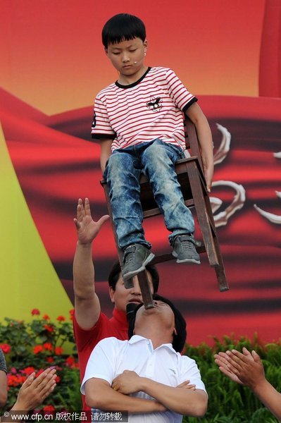 ![]() Zhu Baobing, a farmer from Guli township, Changshu city, East China's Jiangsu province, holds a 40-kg boy sitting on a wooden chair, on his chin during an evening gala held by China Central Television in his hometown, May 30, 2011. [Photo/Xinhua]