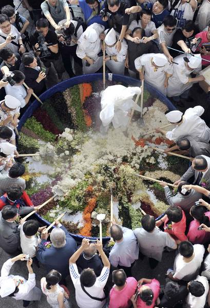 Visitors take pictures as chefs mix a giant bowl of the traditional Korean dish "bibimbap" at an international food exhibition in Shenyang, Northeast China's Liaoning province, July 23, 2011. [Photo/Agencies]