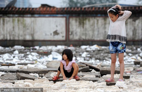 Two girls worry about their schooling for the coming semester in Beijing on August 15, 2011. Their primary school, where most pupils are the children of migrant workers, was demolished on August 10 after the contract between the school and local government ended. Local officials promised the school's students could go to other primary schools in the area, but parents are concerned there may be extra fees to pay and worry places are limited. [Photo/CFP]