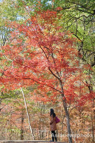 A tourist enjoys the spectacular red leaves of autumn at a valley in Jiaohe, Jilin province, on Oct 7, 2011. [Photo/Asianewsphoto]