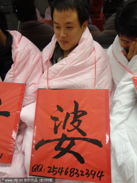 Guys wrapped in quilts ride the No 1 metro line in Shanghai on Nov 1, 2011. [Photo/CFP]