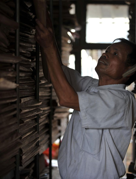 Sun Yanwu works at an old book storeroom built in 1986, preparing to move the books into the new-built library in Duoxiao village, Anding county, Central China's Henan province, Nov 20, 2011.[Photo/Xinhua]