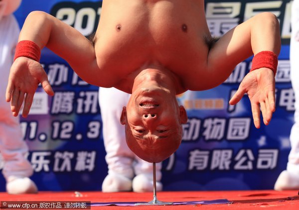 Li Xin, a folk entertainer balances his head on a thin spike during a handstand in Nanning, South China's Guangxi Zhuang autonomous region, Dec 4, 2011. Li, 47, has been practicing the daring headstand for more than 20 years. He weighs 66 kilograms and can balance himself for more than 10 seconds on the bar. [Photo/CFP]