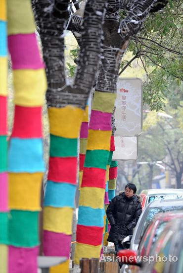 Trees are dressed up in colorful scarves in Nanjing, East China's Jiangsu province, Dec 18, 2011. Some 300 kilograms of scarves have been made by more than 30 volunteers to help keep the trees warm and decorate the city. [Photo/Asianewsphoto]
