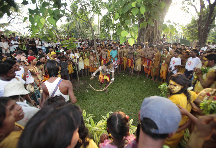 Devotees perform rituals during a Hindu festival in Yangon March 25, 2012. [Photo/Agencies]