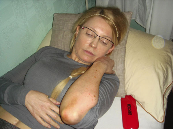 Former Ukrainian Prime Minister Yulia Tymoshenko shows what she claims an injury in the Kachanivska prison in Kharkiv, in this undated handout picture received by media on April 27, 2012. Ukrainian President Viktor Yanukovich, under fire from European politicians over the treatment of his jailed opponent Tymoshenko, has ordered prosecutors to investigate her alleged beating by prison guards last week, he said on Thursday. [Photo/Agencies] |