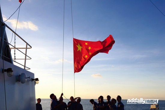 A flag raising ceremony is held on China's fisheries patrol ship Yuzheng 310, South China Sea. Picture taken on May 8, 2012. [Photo/nddaily.com]