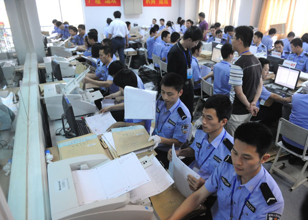 Police officials begin scanning some 2.7 million National College Entrance Examination answer papers in Nanjing, East China's Jiangsu province, June 12, 2012. The gaokao papers are divided into two parts. One part is marked automatically by a computer program. The second part is uploaded for exam markers. [Photo/Asianewsphoto]