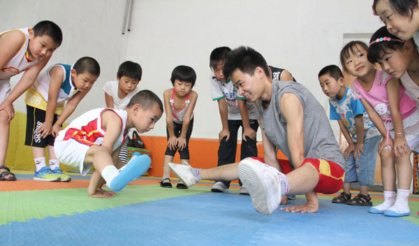 A child copies Zhou Pengfei during a free dance training course in Lvyi township, Shandong province on July 6. Zhou, who studies performance at a university in Hubei province, organizes free dance training course with another student Zhao Tingting during the summer holidays. [Photo/Xinhua] |