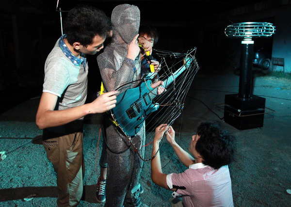 Wang Zengxiang and his friends ensure the protective clothing is fitted correctly in order to protect Wang from the extremely high voltage electric current he will be exposed to during the stunt. [Photo/Asianewsphoto]