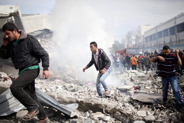Palestinians run after an Israeli air strike on a house in Gaza City Nov 18, 2012. [Photo/Agencies] |