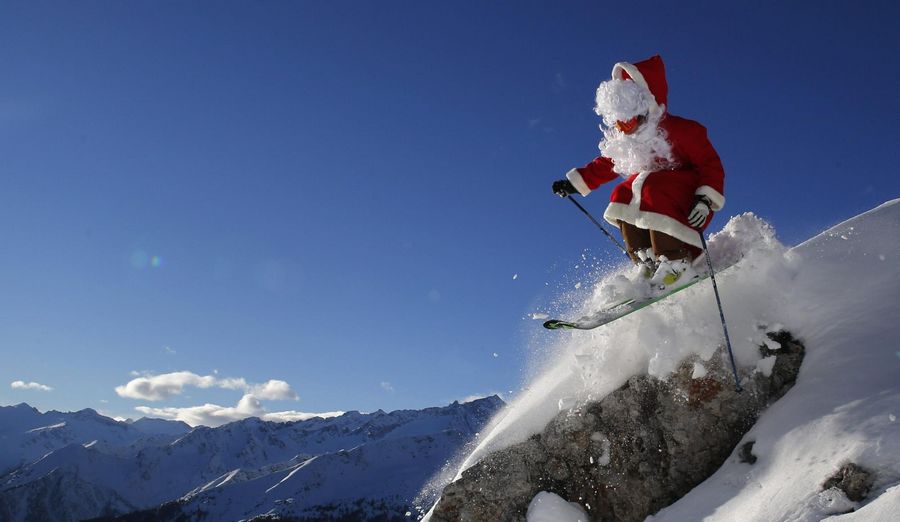 A freerider dressed in Santa Claus costume, ski teacher Alberto Ronchi jumps in Madonna di Campiglio in northern Italy December 17, 2012. [Photo/Agencies]