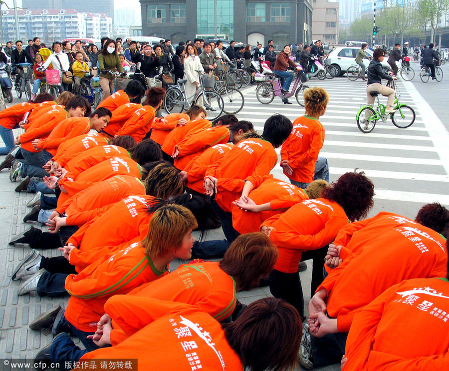 Employees of a hair salon greet passers-by good morning during a training course in Nanjing, April 15, 2005. [Photo/CFP]