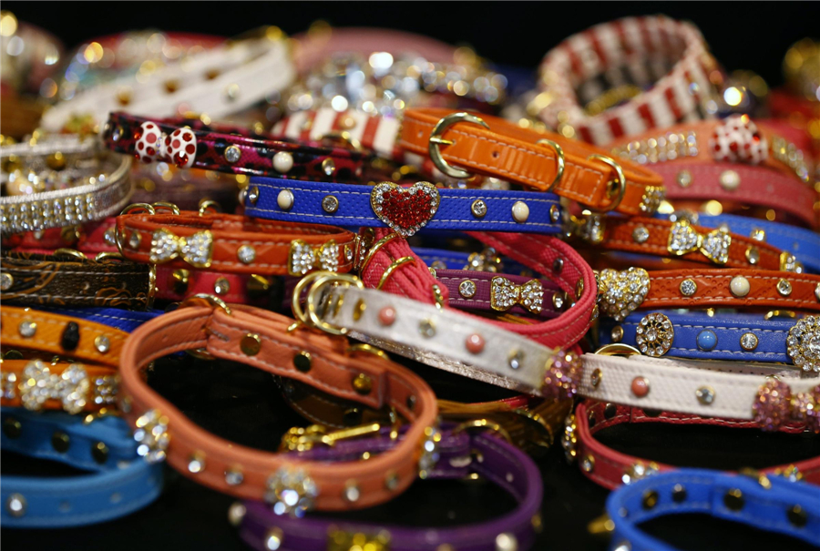 Collars are displayed for sale during the first day of the Crufts Dog Show in Birmingham, Central England March 7, 2013. [Photo/Agencies]