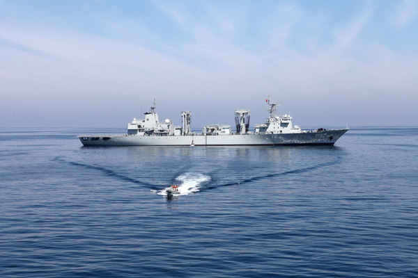 Naval commandoes return to the command ship Harbin after a combat rescue drill of China’s 14th escort fleet on March 10 in the Arabian Sea.[Photo/Xinhua] |