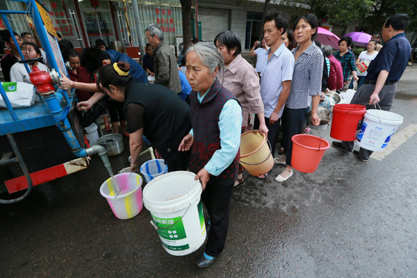People with buckets wait in line to take back water from a water delivering point in the Yingpanliang District of Guangyuan city, Southwest China’s Sichuan province on May 28, 2013. [Photo by Liu Ren/Asianewsphoto] |
