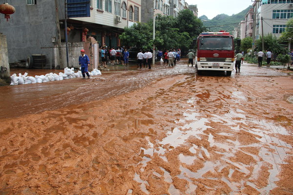 Cement slurry was spilled by the Guangxi branch of China Aluminium Corp in Pingguo county, Guangxi Zhuang autonomous region, June 24, 2013. The leakage, which happened June 17-21, has affected local residents. Authorities blamed the leakage on frequent earthquakes in the area. [Photo/CFP]