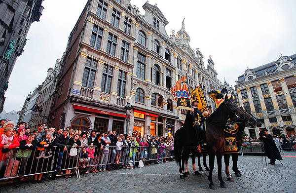 People swarm to Grand Place, the central square of Brussels, Belgium, to watch the annual Ommegang parade, on July 4, 2013. [Photo/Xinhua] |