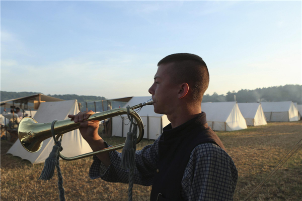 Federal (Union) bugler Nick Barto, of Cleveland, Ohio, plays reveille as the Federal camp wakes up during re-enactment activities, July 7, 2013, recognizing the 150th anniversary of the US Civil War battle in Gettysburg, Pennsylvania. [Photo/Agencies] |
