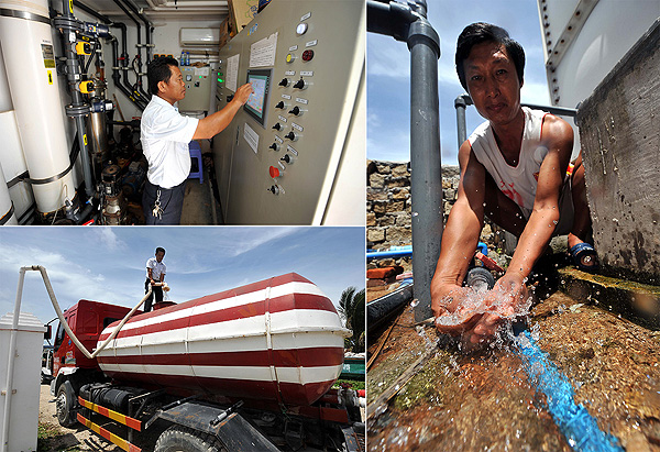 Workers desalinate sea water in Yongchang island of Sansha, Hainan province, on July 8, 2013. [Photo/Xinhua]