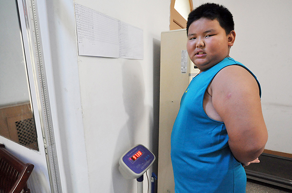 A boy meaures his weight at a a summer camp which aims to help obese children lose weight in Zhengzhou, Henan province, on July 14, 2103. [Photo by Zhang Tao/Asianewsphoto]