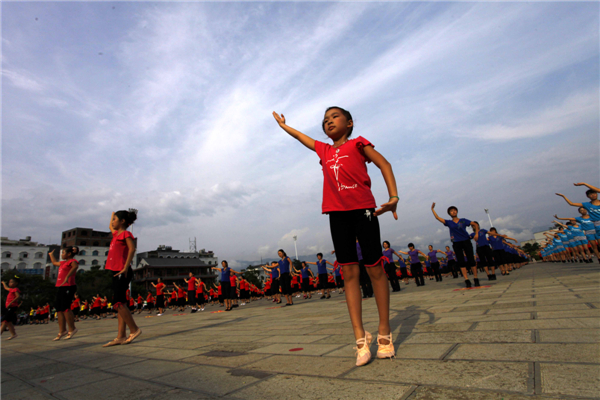 A total of 1,110 dance enthusiasts participate in a promotion event to mark National Fitness Day in Qiaojia county, Southwest China's Yunnan province, Aug 8, 2013. [Photo by Yan Keren/Asianewsphoto]