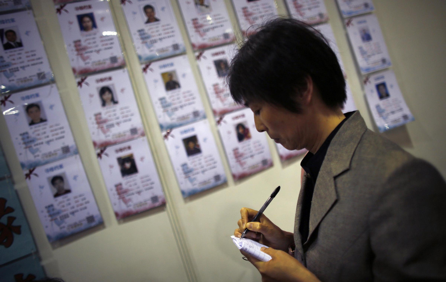 A woman, who is looking for a spouse for her child, takes notes from a personal profile board during a mass wedding organised as part of a matchmaking event in Shanghai May 18, 2013. [Photo/Agencies]