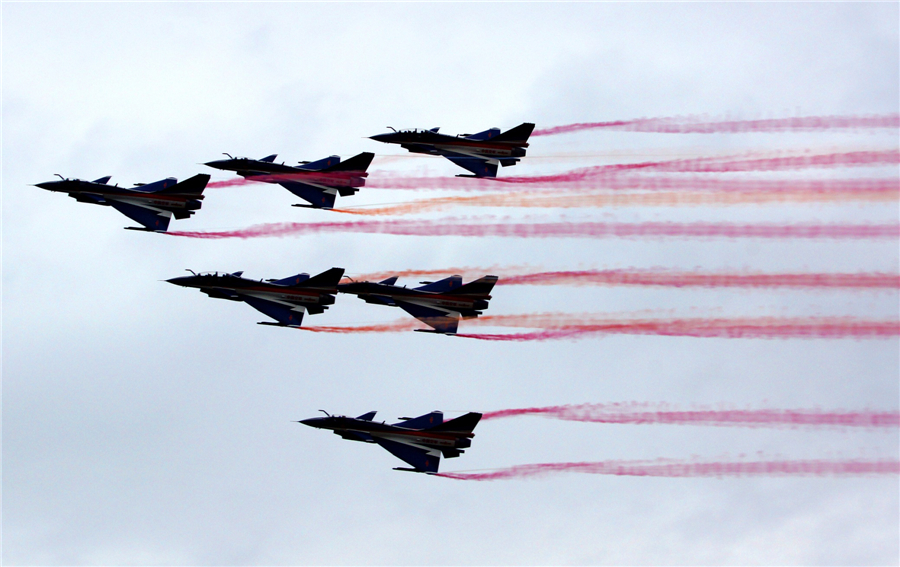 The People's Liberation Army's August 1st Aerobatics Team performs at the MAKS-2013 air show in Zhukovsky outside Moscow on Aug 30.[Photo/Xinhua]