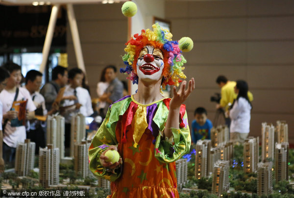 A clown juggles during a house exhibition in Wuxi city, East China's Jiangsu province, May 19, 2012. [Photo/CFP]
