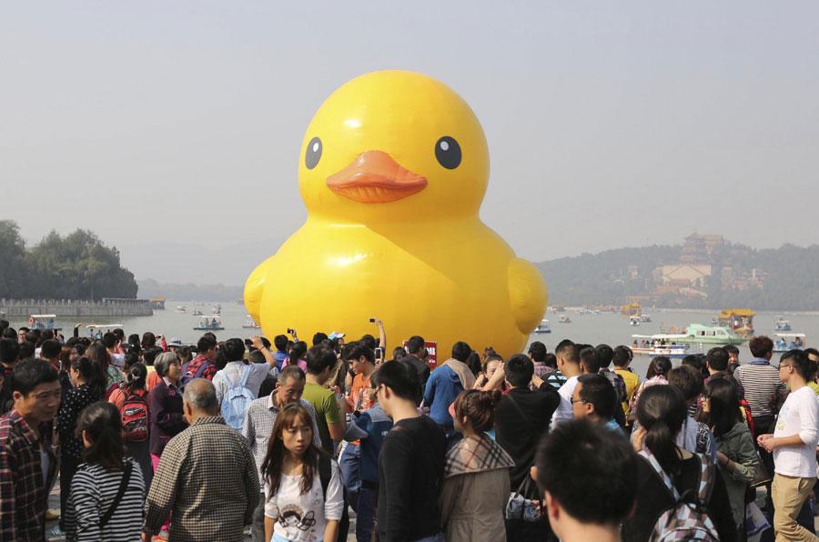 Visitors flock to the Summer Palace in Beijing to watch the 18-meter rubber duck created by Dutch artist Florentijn Hofman, Oct 3. [Photo/Xinhua]
