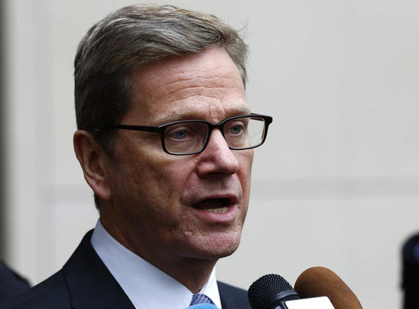 German Foreign Minister Guido Westerwell speaks to media after his arrival at the Intercontinental Hotel in Geneva November 23, 2013. Talks on Iran's nuclear programme were "not a done deal," Guido Westerwelle said on Saturday, as foreign ministers of six world powers gathered in Geneva for a fourth day of negotiations. [Photo/Agencies] |