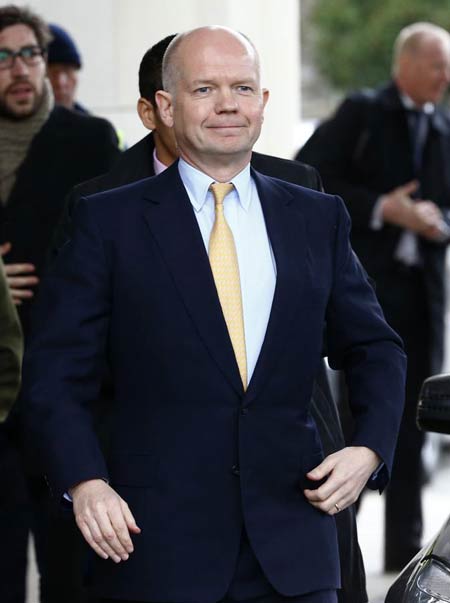 British Foreign Secretary William Hague arrives at the Intercontinental Hotel in Geneva November 23, 2013. Iran and six world powers struggled on Friday to budge sticking points in negotiations aimed at securing an interim accord to curb Tehran's nuclear programme in exchange for sanctions relief. [Photo/Agencies] |