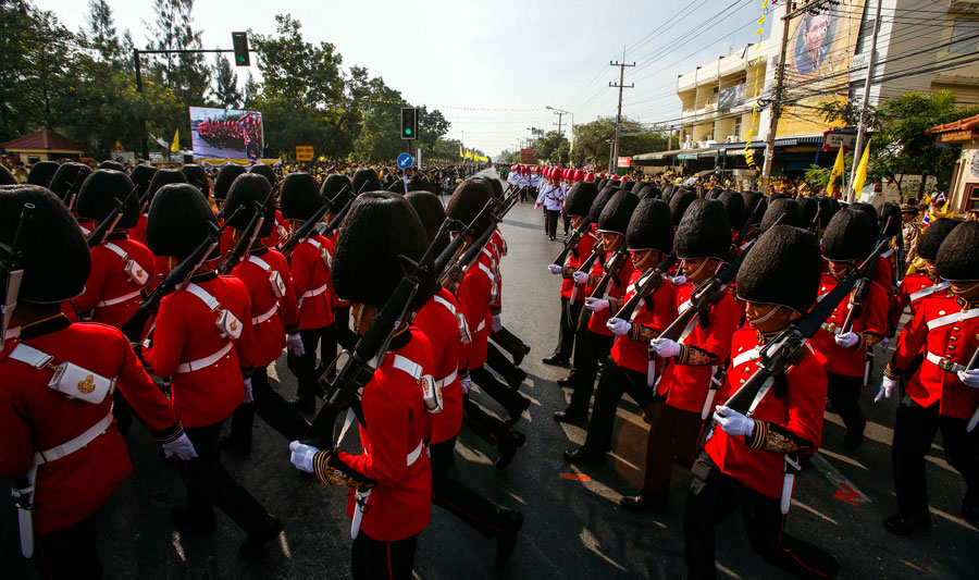 Thai royal guards of honour march during a parade to celebrate Thai King Bhumibol Adulyadej's 86th birthday at Klai Kangwon Palace, Hua Hin, Prachuap Khiri Khan province, Dec 5, 2013. Thailand's revered King Bhumibol Adulyadej called on his people to do their duty for the security of the country in his birthday address on Thursday but he avoided making direct reference to the latest political turmoil. Thailand's King Bhumibol, the world's longest reigning monarch celebrates his 86th birthday on Thursday. [Photo/Agencies]