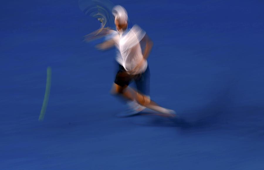Jack Sock of the United States hits a return to Gael Monfils of France during their men's singles match at the Australian Open 2014 tennis tournament in Melbourne January 16, 2014. [Photo/Agencies]