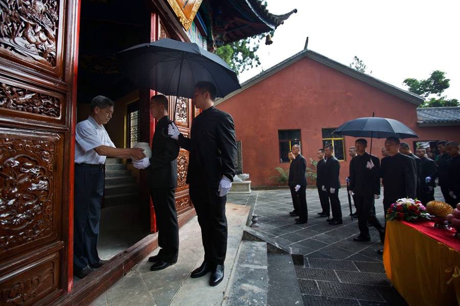 Ashes of the Chinese Expeditionary Force soldiers are taken out of a pagoda in a local temple in Tengchong, Yunnan province, at 8:20 am on June 12, 2014. [Photo by Meng Zhubin/Asianewsphoto]