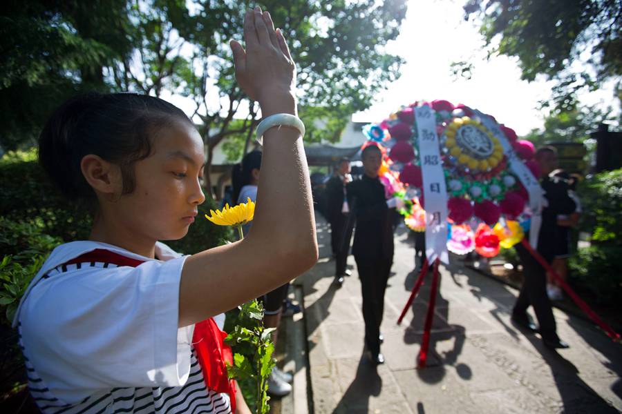 Girl salutes as the ashes of the Chinese Expeditionary Force soldiers are taken to the national martyrs' cemetery in Tengchong, Yunnan province, June 12, 2014. [Photo by Meng Zhubin/Asianewsphoto]