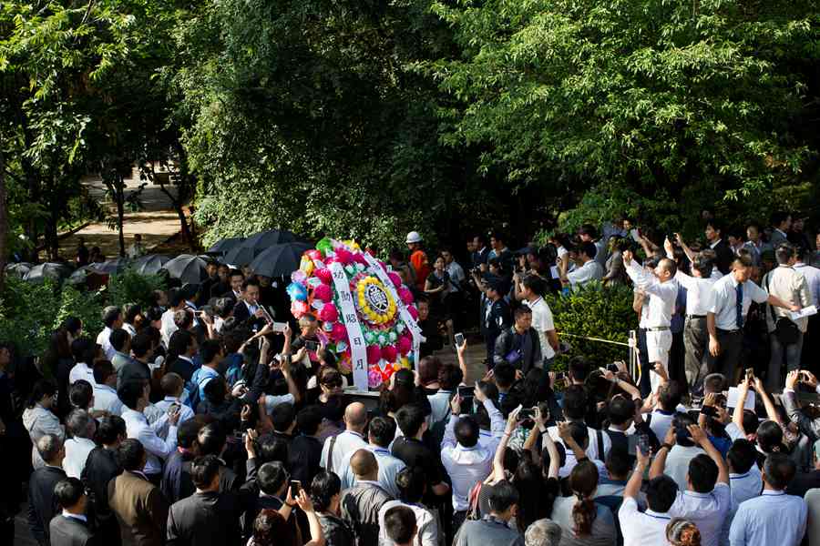 Ashes of the Chinese Expeditionary Force soldiers are taken to the tombs for the Chinese Expeditionary Force martyrs who died fighting against the Japanese aggression, in the national martyrs' cemetery in Tengchong, Yunnan province, June 12, 2014. [Photo by Meng Zhubin/Asianewsphoto] |