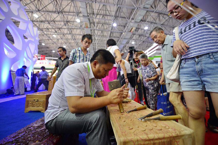 Visitors watch Yujiang woodcarving during the Jiangxi Tourism Product Fair in Nanchang, capital of east China's Jiangxi Province, Sept. 5, 2014. The three-day fair, which kicked off on Friday, presented more than 3,000 items of Chinese tourism commodities, including 38 intangible cultural heritage items in Jiangxi.[Photo/Xinhua] |