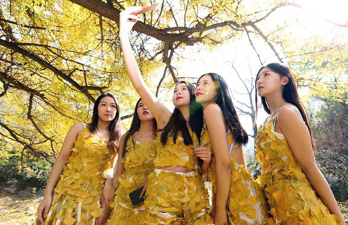 College students wear golden clothes made of gingko leaves