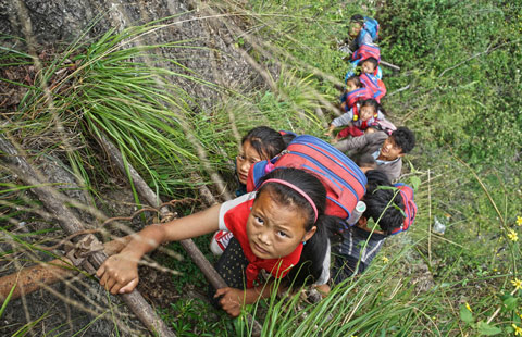 Kids climb vine ladder in 'cliff village' in Sichuan
