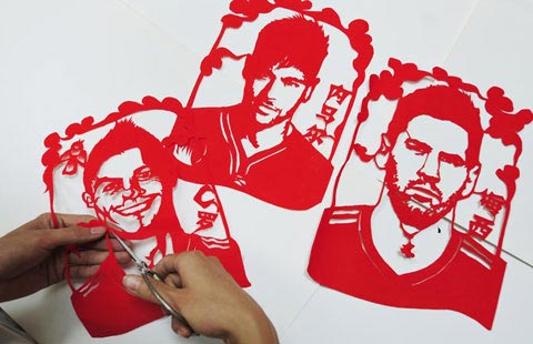 Young craftsman scissors World Cup on paper